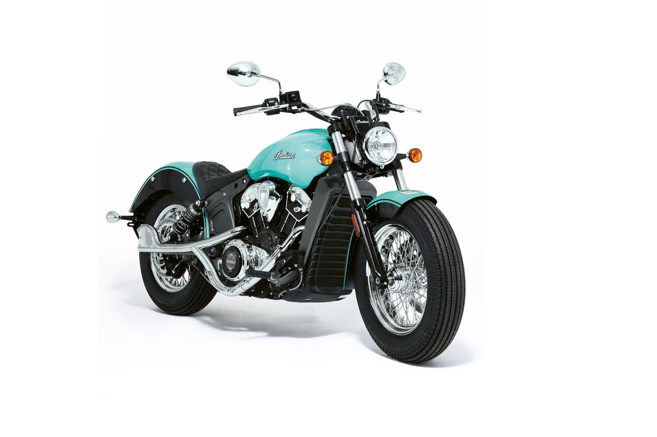 Indian Scout Model featuring custom-laced wheels with chrome-plated rims and spokes dressed in vintage tread tires, a custom high-polished stainless steel exhaust, Tiffany-designed engine covers, a custom Tiffany sterling silver plaque on the front fender and a custom Tiffany Blue® paint job.